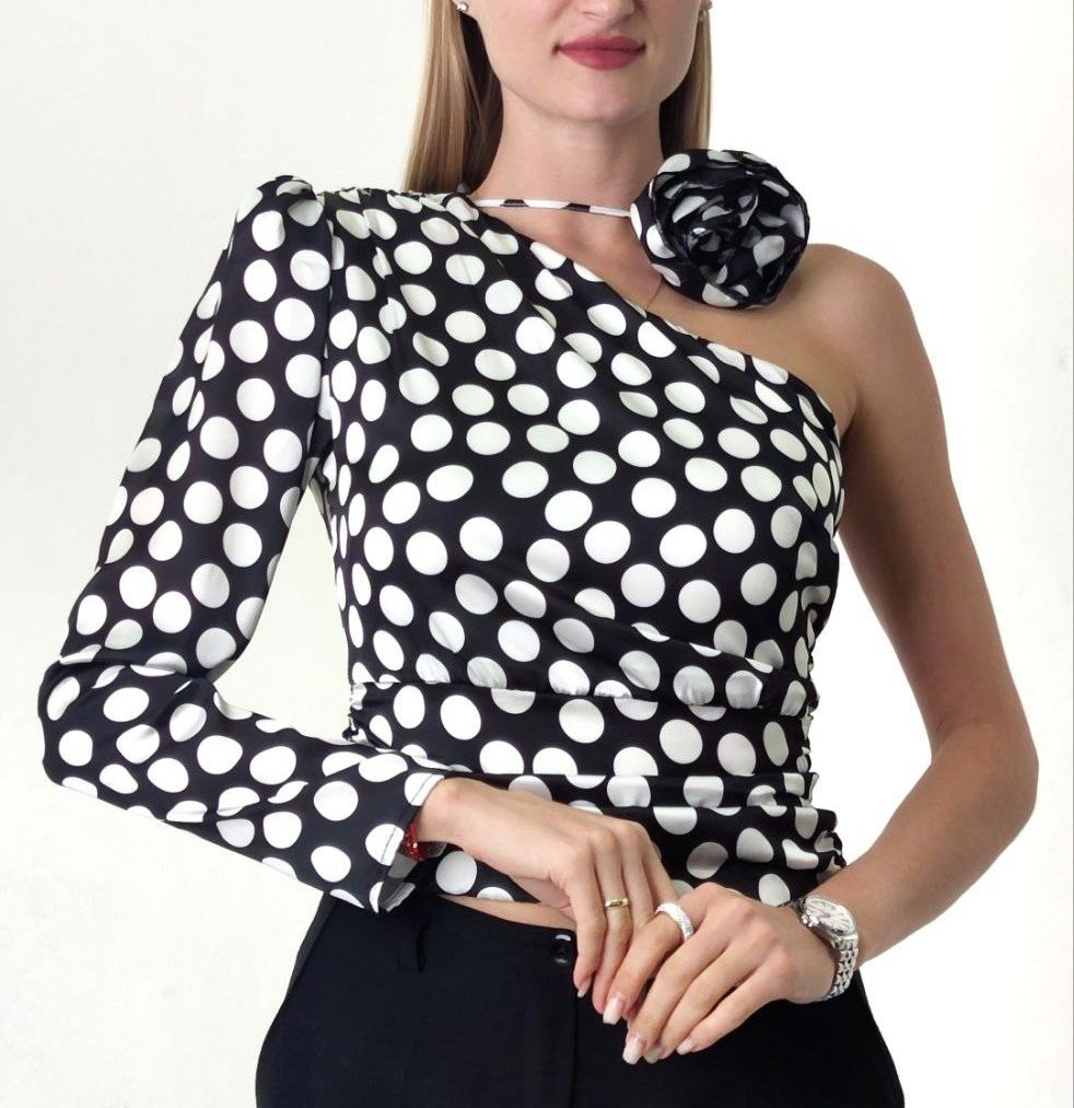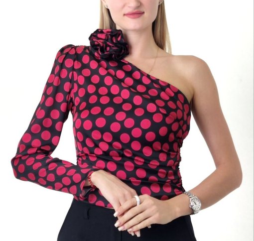 1 SLEEVE POLKA DOT TOP WITH FLOWER DETAIL