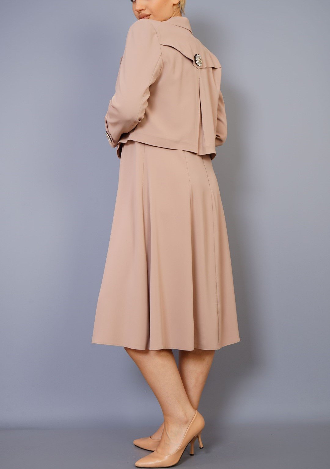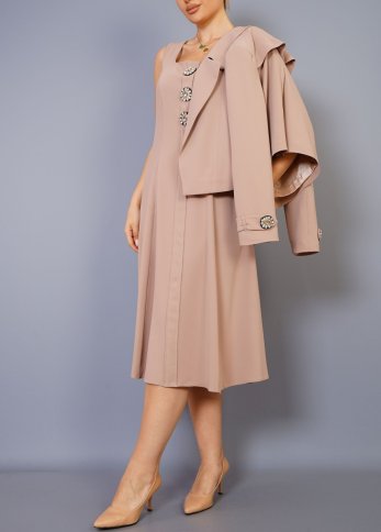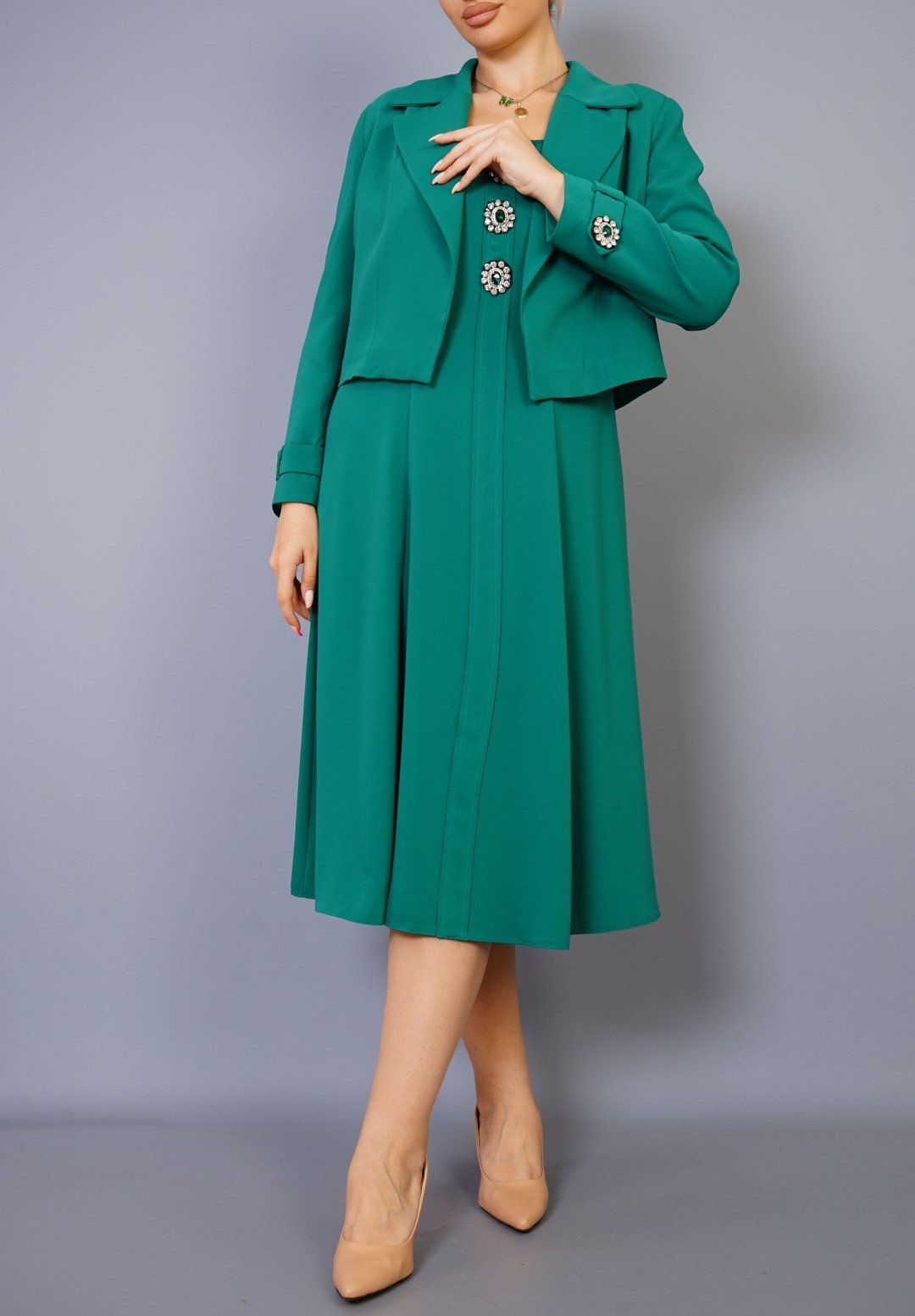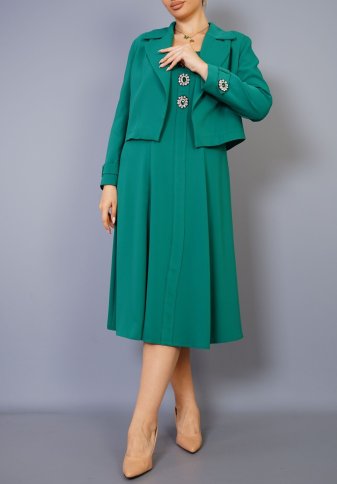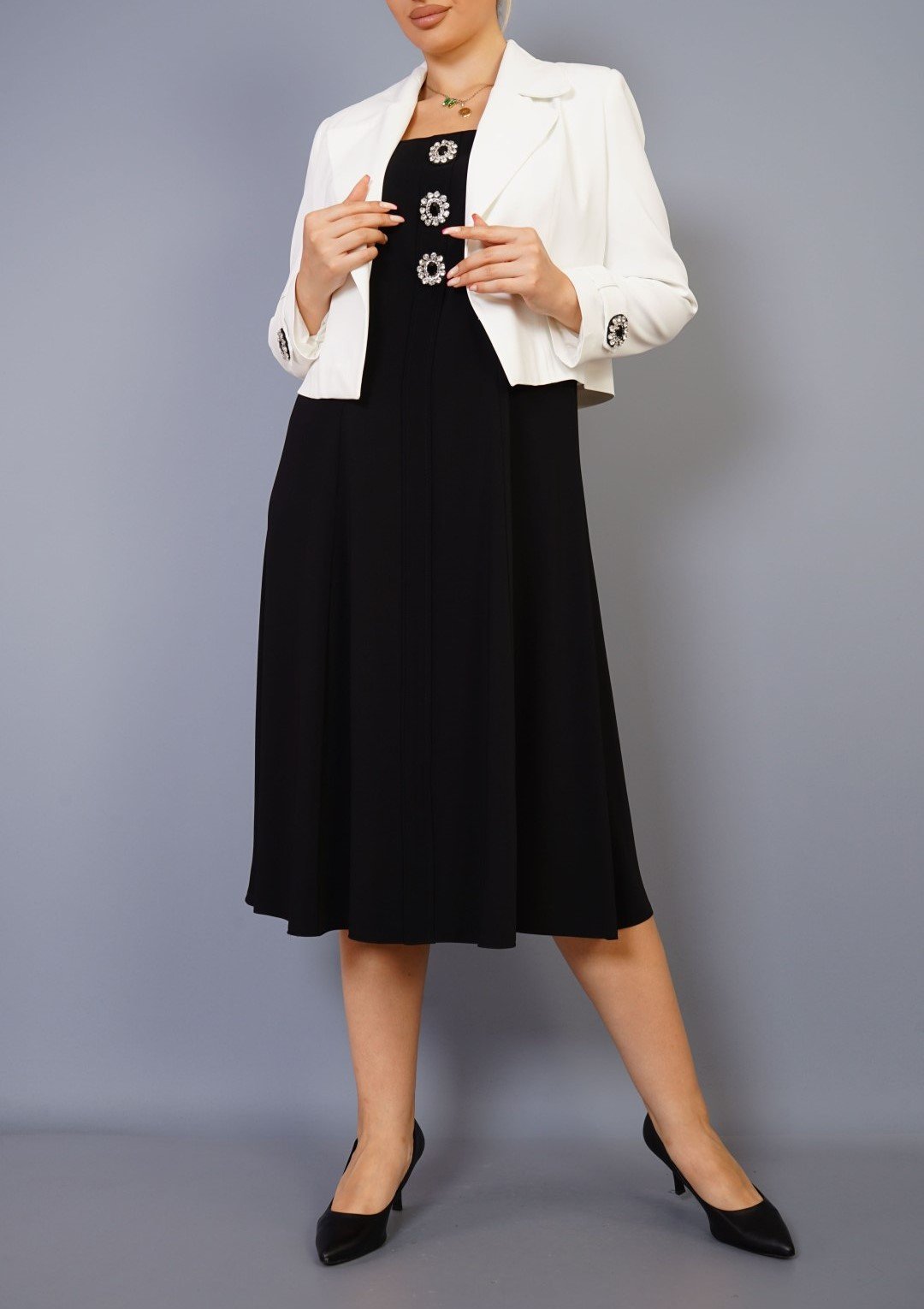 CROP JACKET OVER MIDI DRESS WITH DIAMANE BUTTON DETAIL