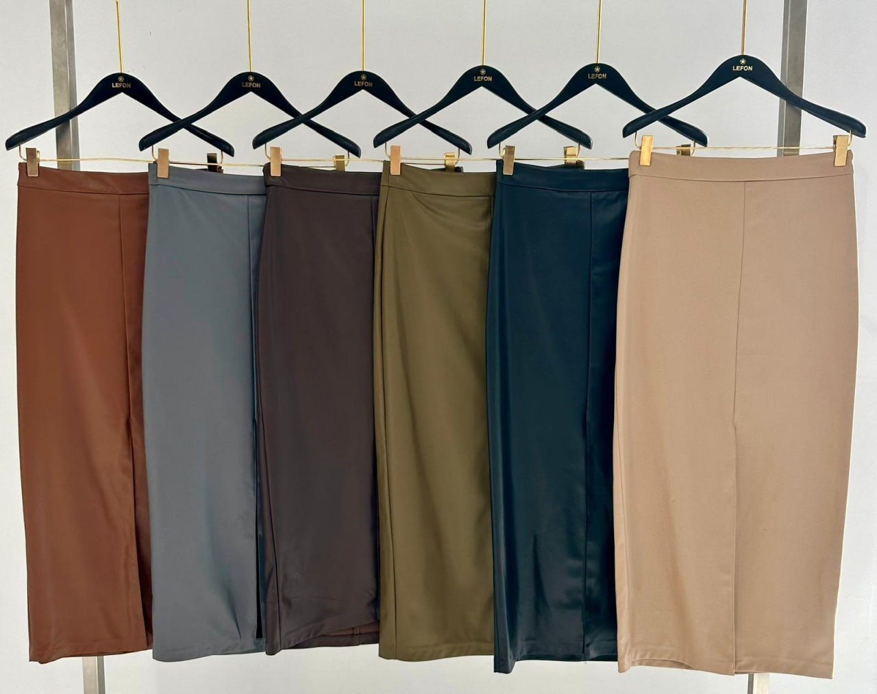 FRONT SLIT FAUX LEATHER MIDI SKIRT