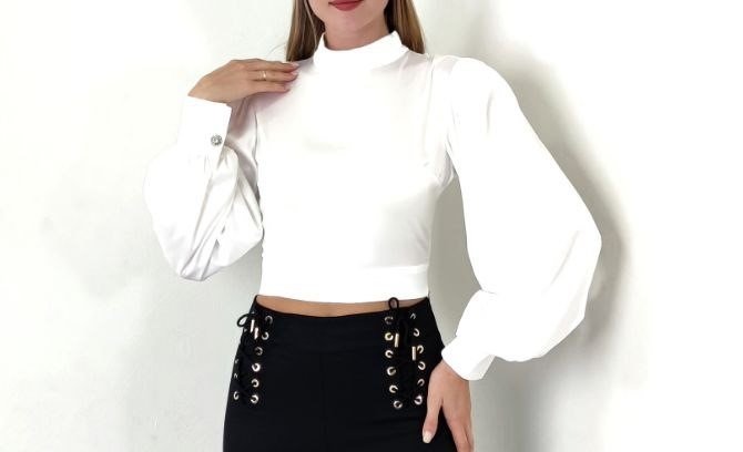 HIGH NECK LONG SLEEVE BLOUSON SATIN BLOUSE