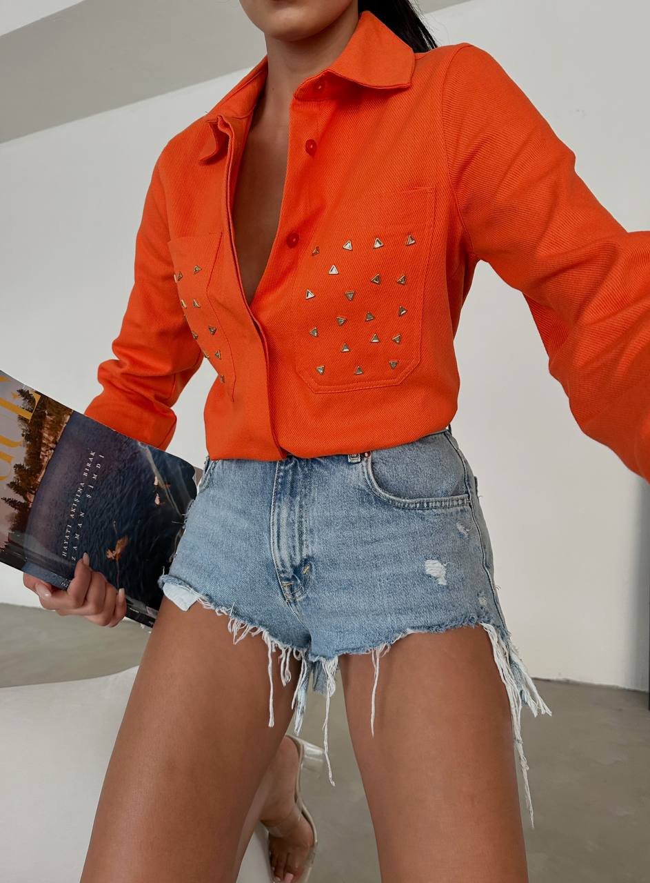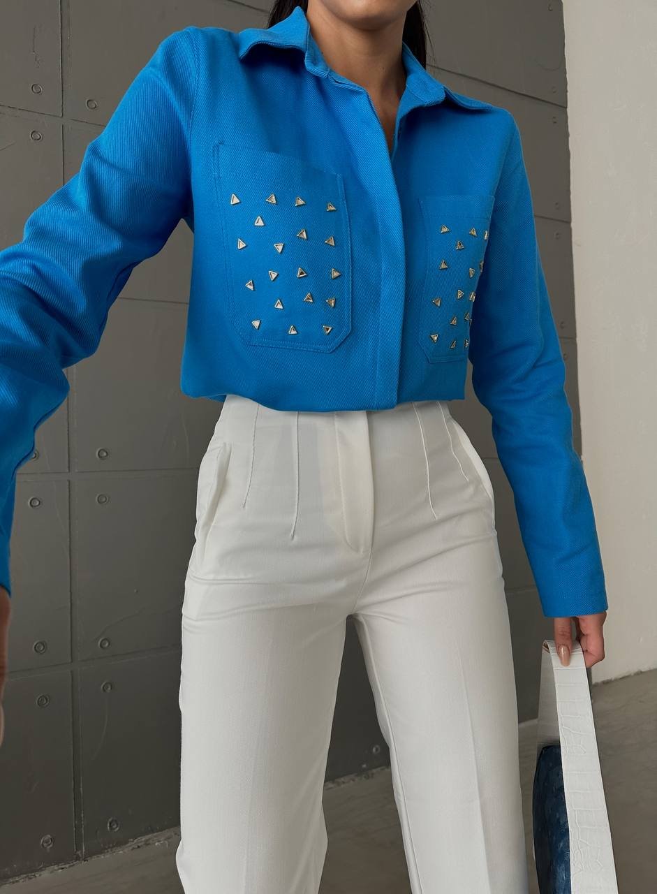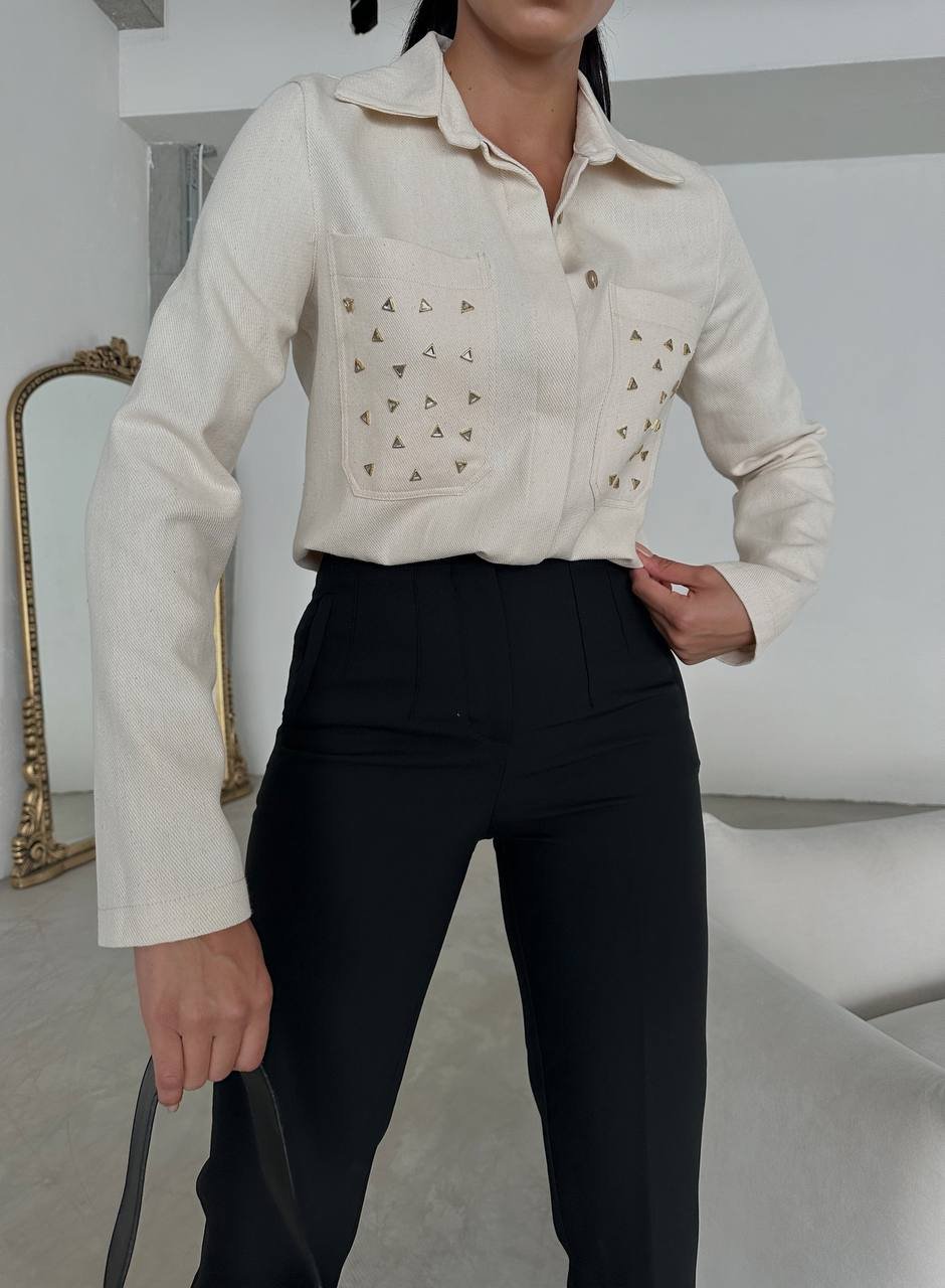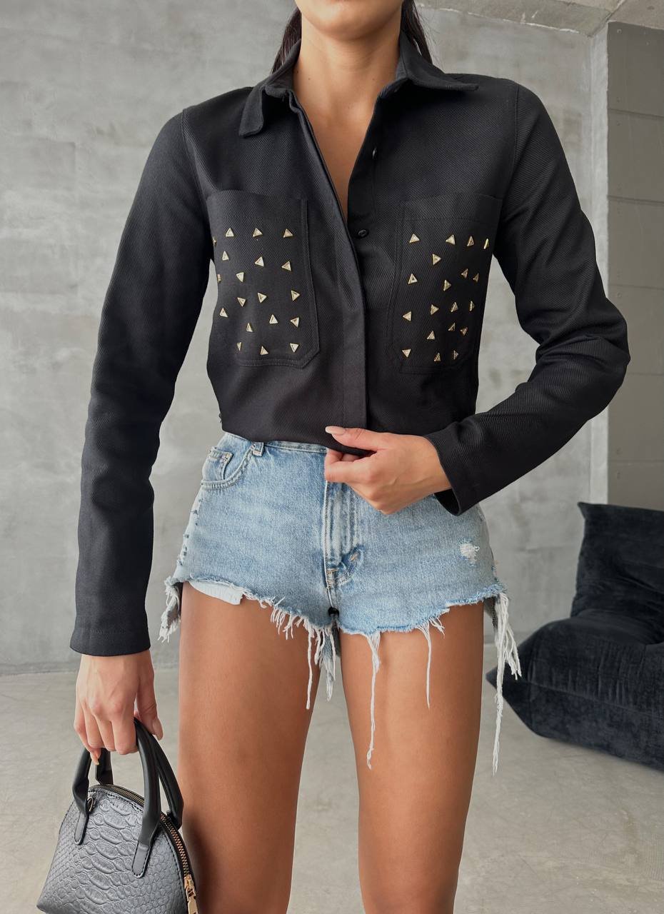 INVISBILE BUTTON FRONT SHIRT WITH METALLIC DETAILS