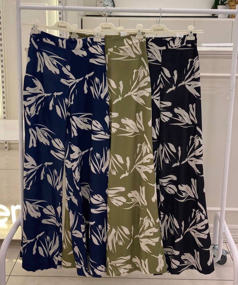 LEAF PATTERNED SILKY FLARED PANTS