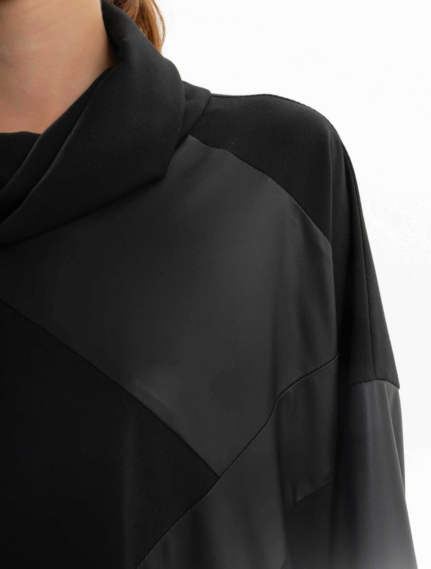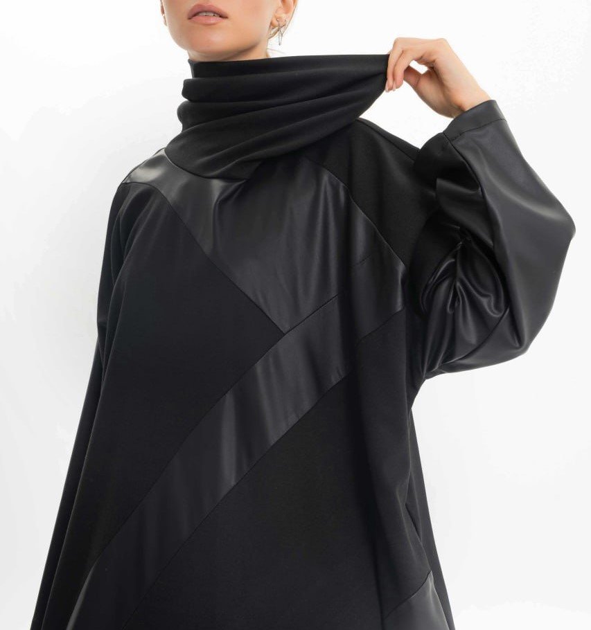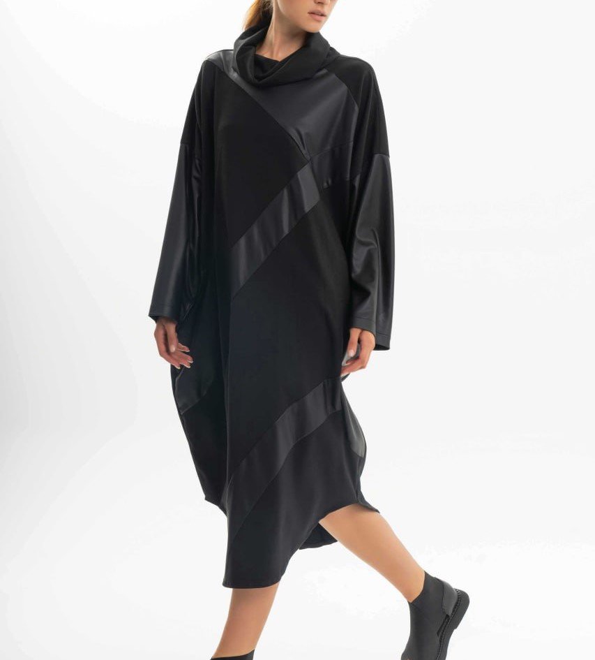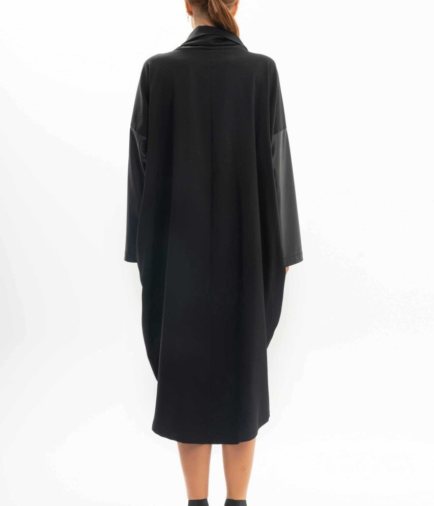 MIDI HIGH NECK COLLAR DRESS WITH FAUX LEATHER DETAIL
