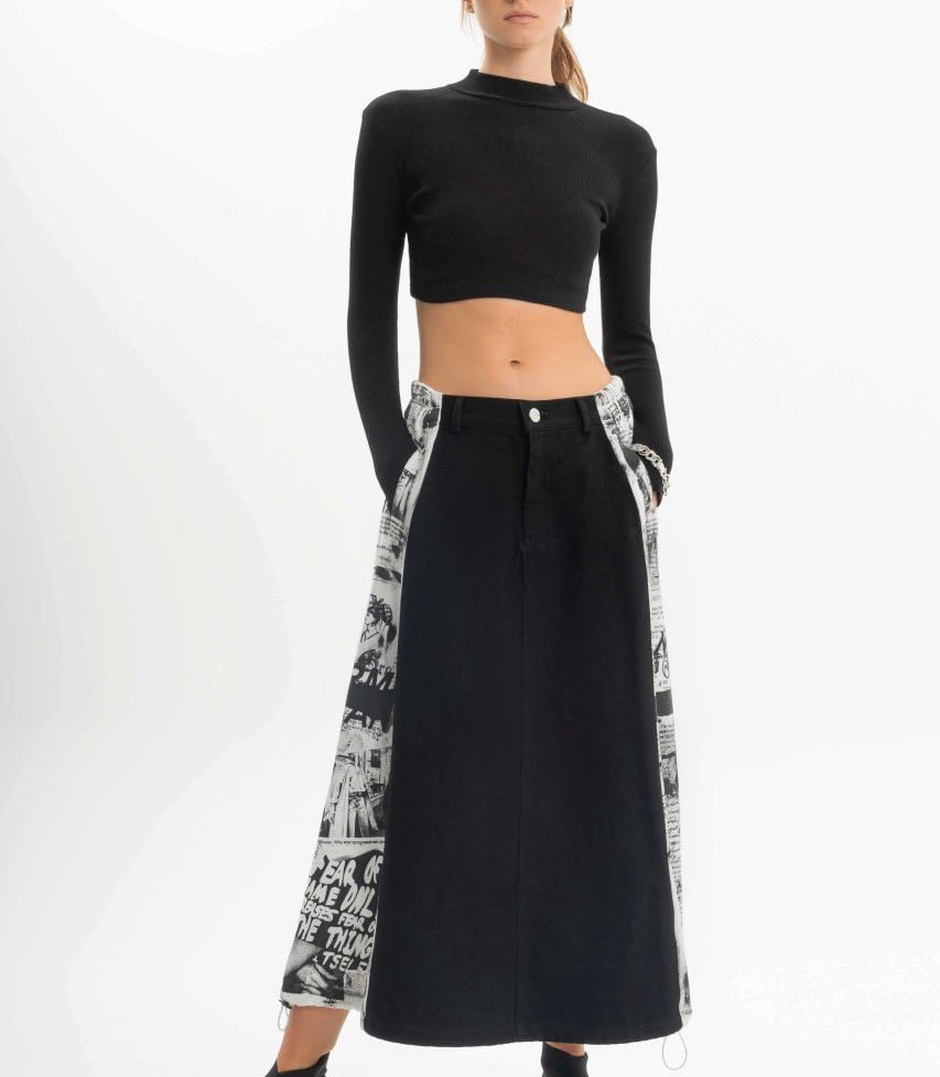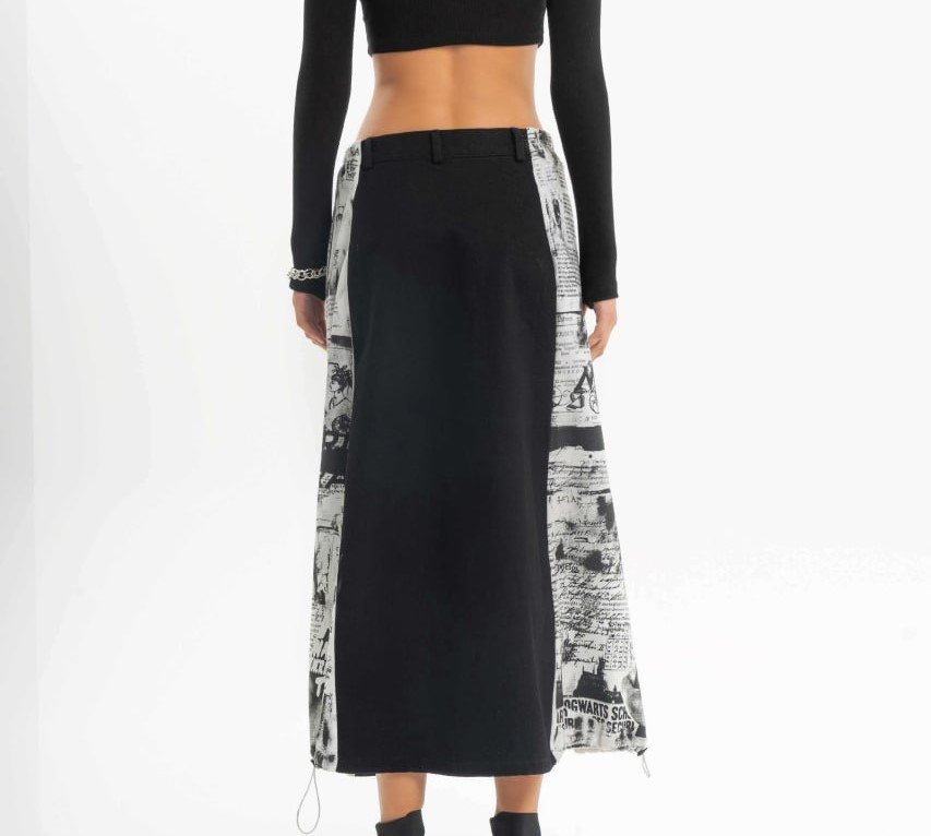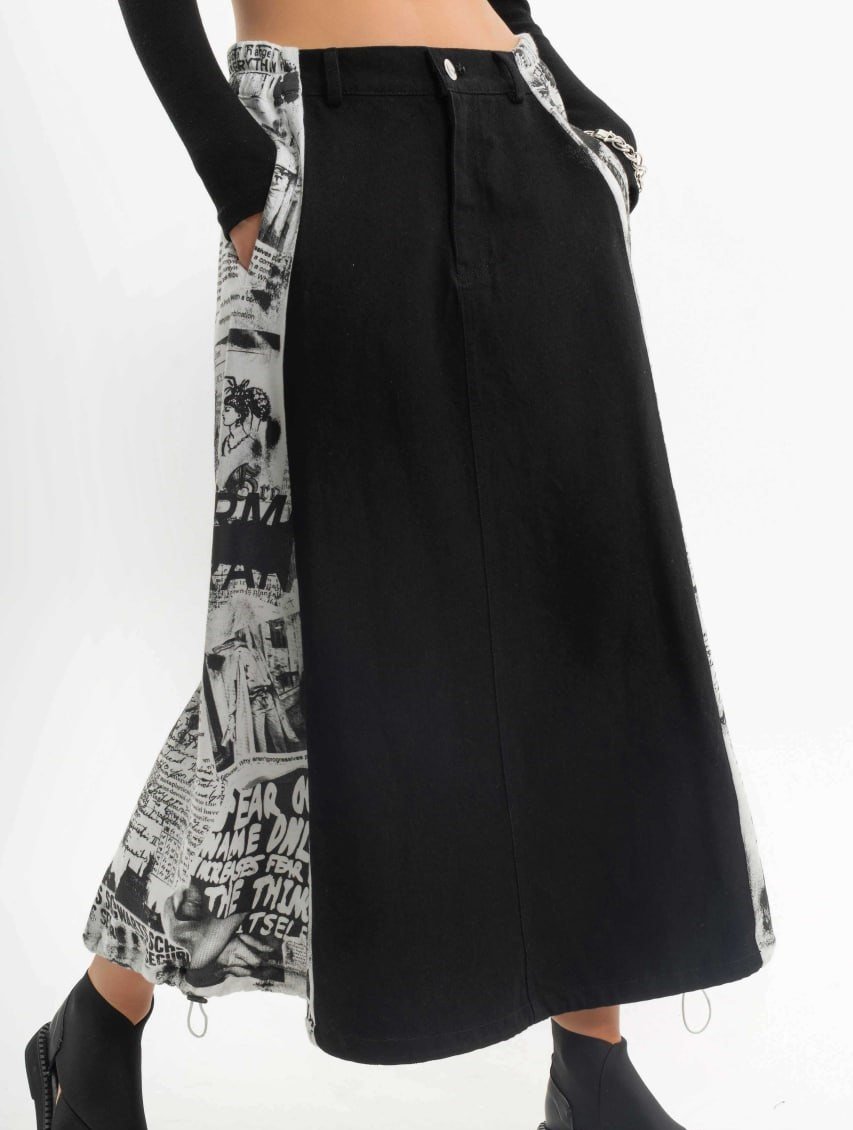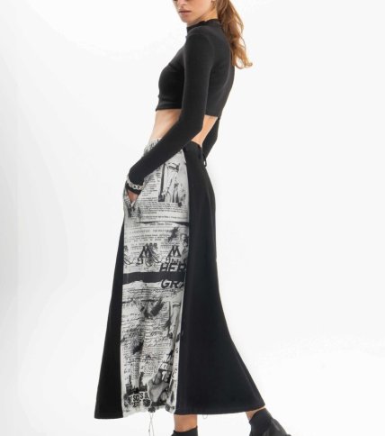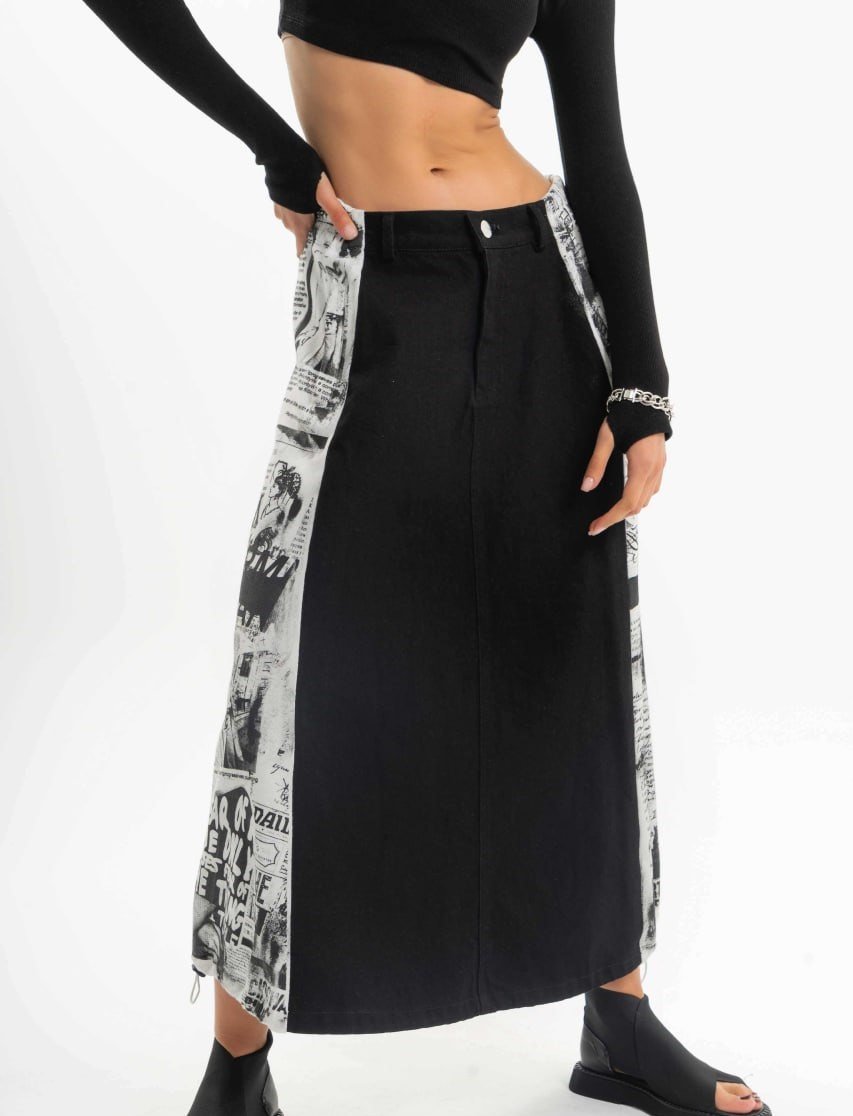 NEWSPAPER PRINT MAXI FLARED SKIRT