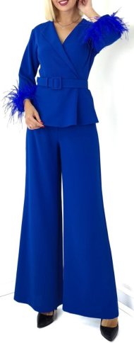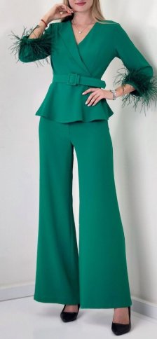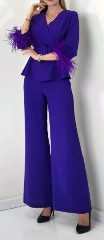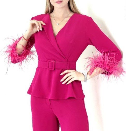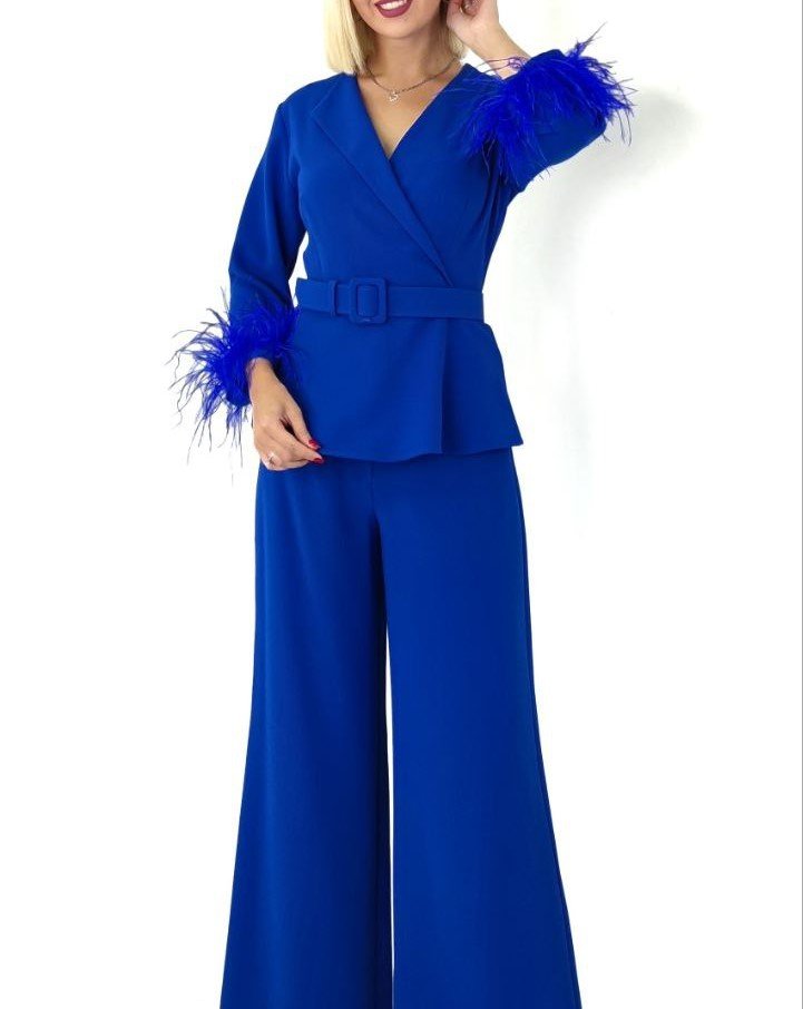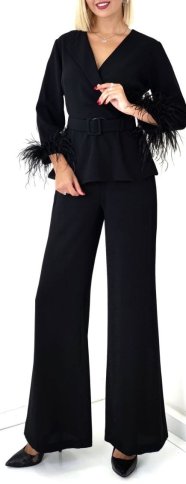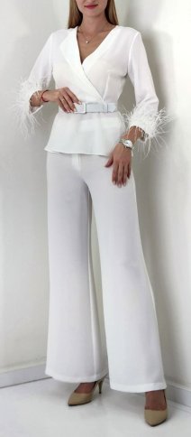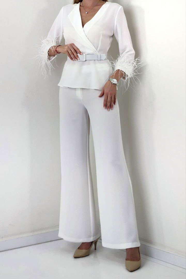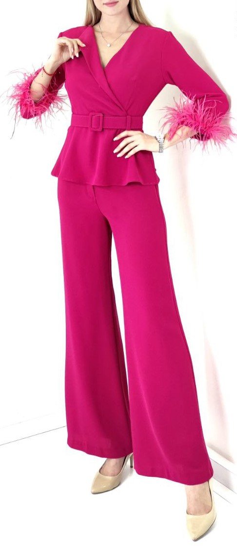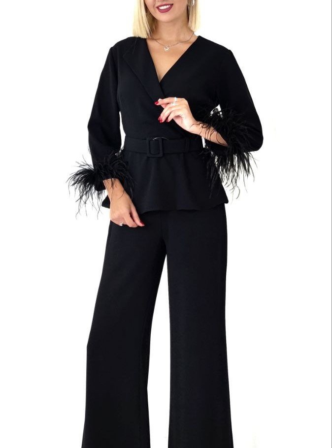 PEPLUM TOP WITH FEATHER CUFFS AND FLARED PANTS