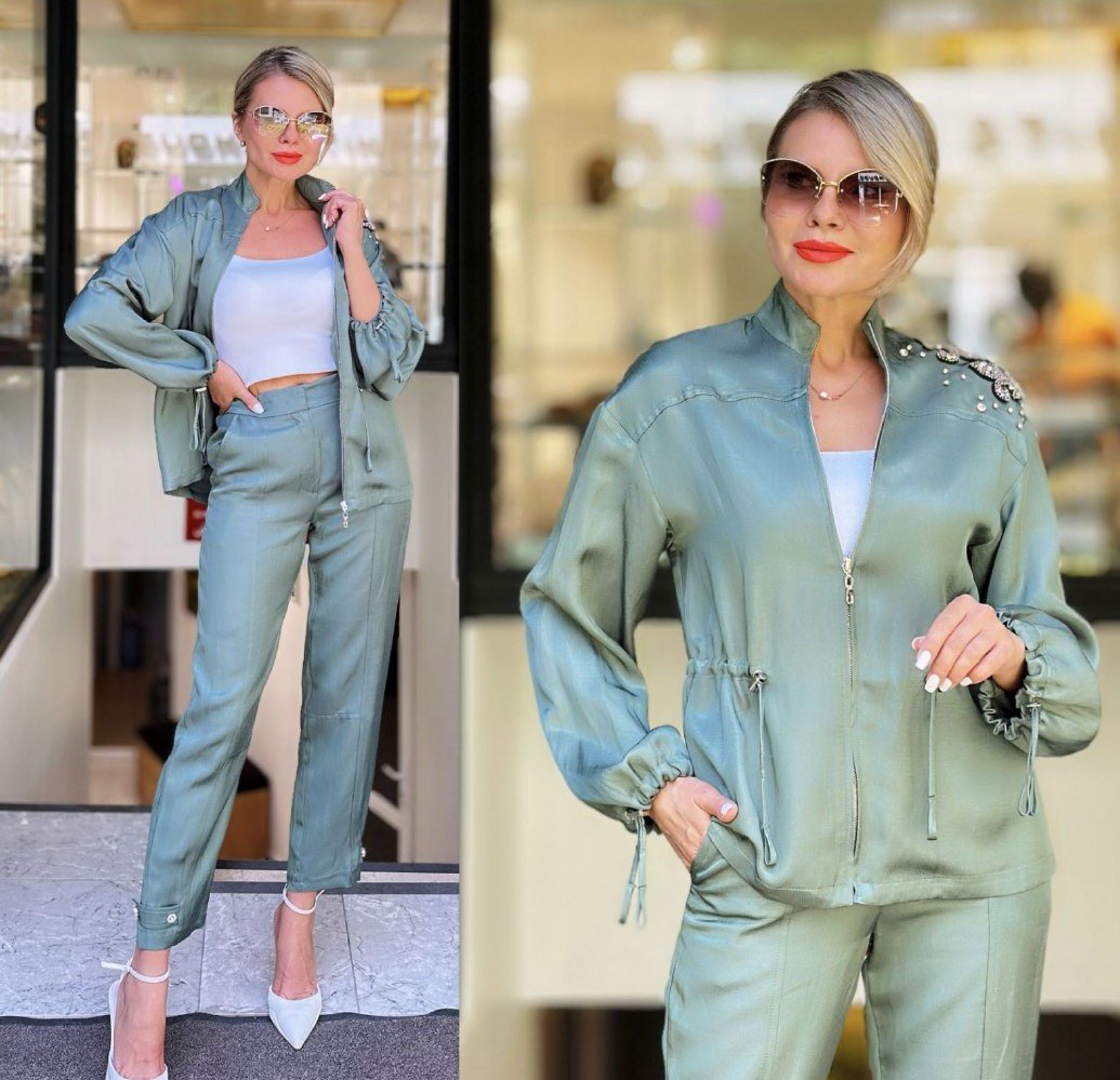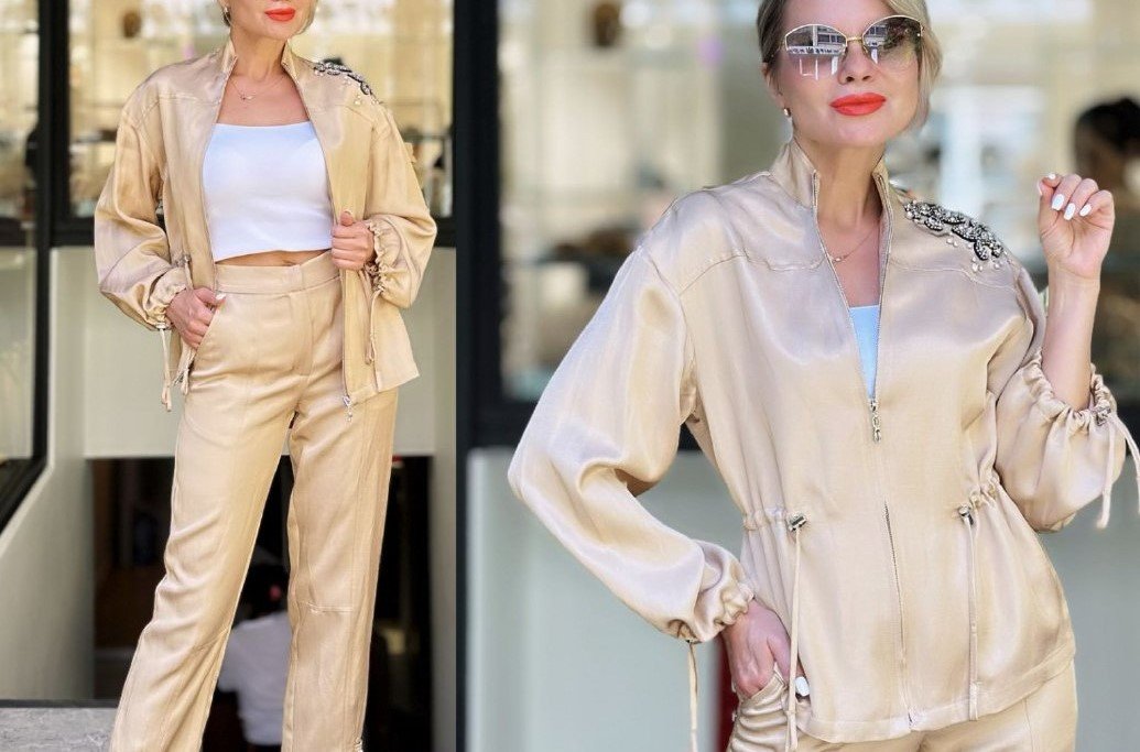 SATIN JACKET WITH DRAWSTING SIDES AND DIAMANTE DETAIL